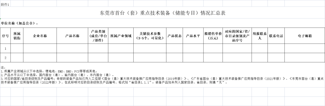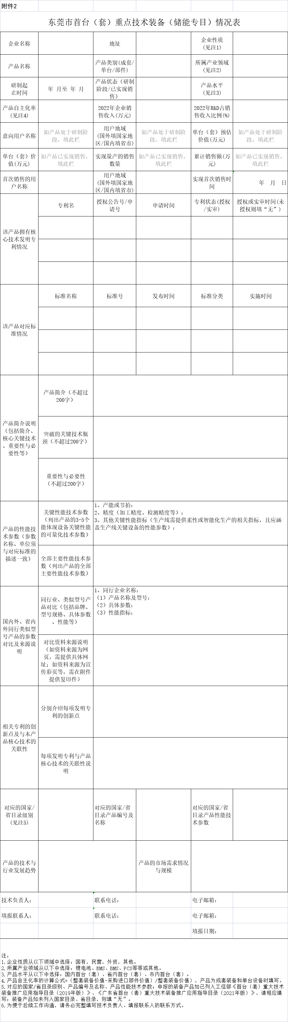 1、《東莞市首臺(tái)(套)重點(diǎn)技術(shù)裝備(儲(chǔ)能專目)情況表》(按照裝備產(chǎn)品處于研制階段、已實(shí)現(xiàn)首次銷售分別填寫不同表格);