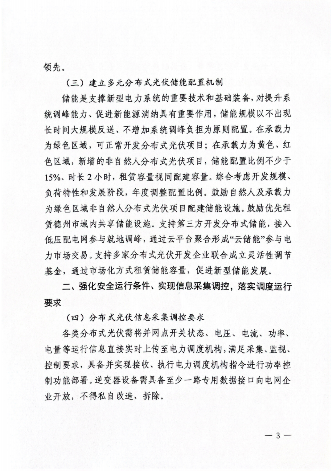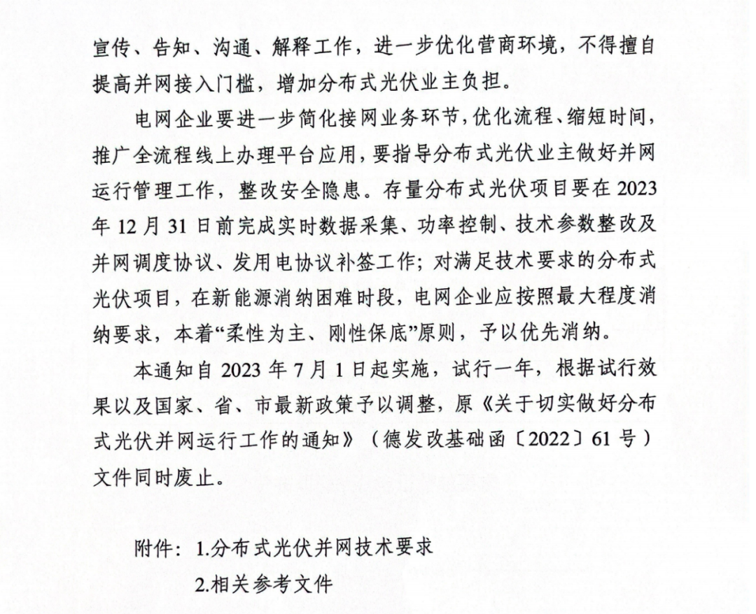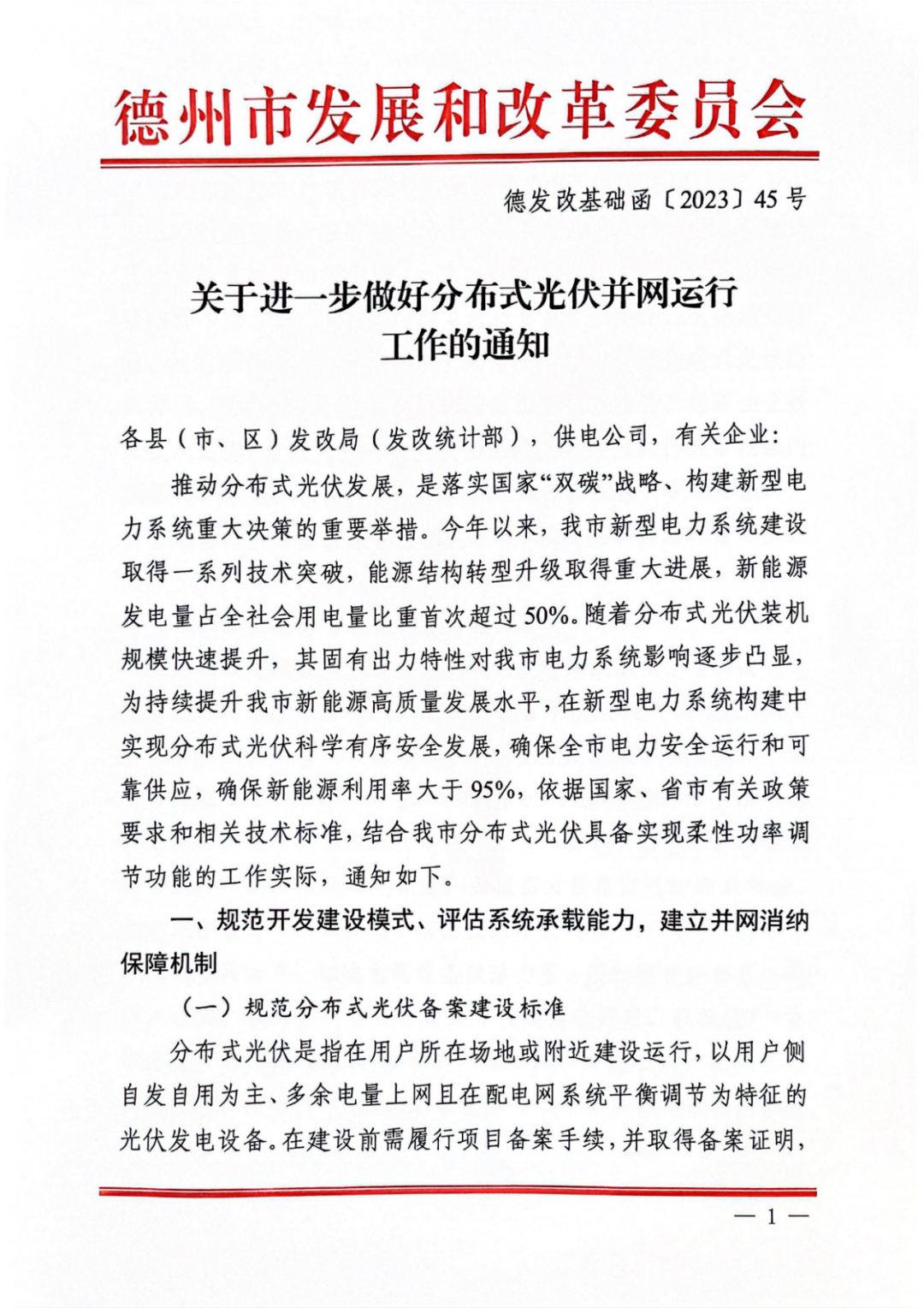 中國(guó)儲(chǔ)能網(wǎng)訊:5月31日,山東省德州市發(fā)改委正式下發(fā)《關(guān)于進(jìn)一步做好分布式光伏并網(wǎng)運(yùn)行工作的通知》(德發(fā)改基礎(chǔ)函〔2023〕45號(hào)),文件將從2023年7月1日起實(shí)施,試行一年。