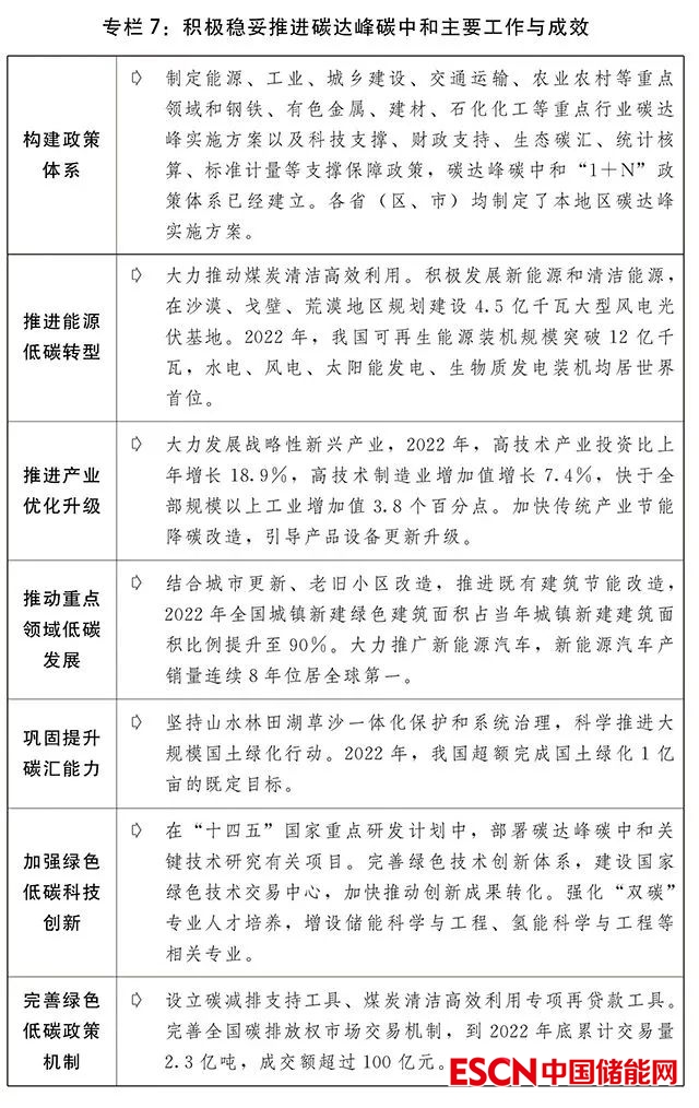 二是碳達(dá)峰碳中和積極穩(wěn)妥推進(jìn)。碳達(dá)峰碳中和“1+N”政策體系構(gòu)建完成,重點領(lǐng)域碳達(dá)峰實施方案和配套保障措施制定出臺,“碳達(dá)峰十大行動”扎實推進(jìn)。全國碳排放權(quán)交易市場平穩(wěn)運行。堅持“先立后改”,加快建設(shè)先進(jìn)清潔支撐性煤電,推動煤電機組節(jié)能降碳改造、靈活性改造、供熱改造“三改聯(lián)動”,積極發(fā)展新能源和清潔能源,第一批以沙漠、戈壁、荒漠地區(qū)為重點的大型風(fēng)電光伏基地加快建設(shè),我國可再生能源總裝機突破12億千瓦。重點行業(yè)節(jié)能降碳大力推進(jìn),提高新建建筑節(jié)能水平,積極發(fā)展綠色建筑,大力推廣新能源汽車,持續(xù)推動充電基礎(chǔ)設(shè)施建設(shè),加快推進(jìn)大宗貨物和中長距離貨物運輸“公轉(zhuǎn)鐵”、“公轉(zhuǎn)水”。單位國內(nèi)生產(chǎn)總值二氧化碳排放下降0.8%。積極參與聯(lián)合國氣候變化沙姆沙伊赫大會各項談判磋商,推動大會取得積極成果。