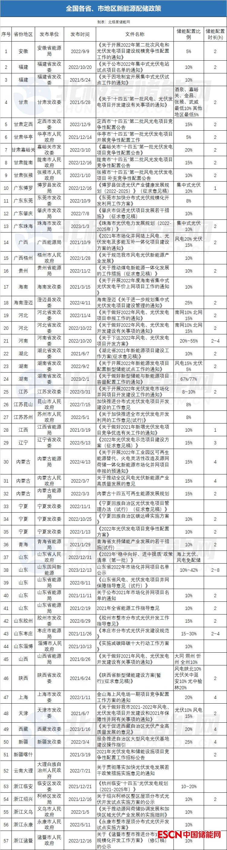 中國(guó)儲(chǔ)能網(wǎng)訊:據(jù)不完全統(tǒng)計(jì),截至目前,全國(guó)已有46個(gè)地區(qū)發(fā)布新能源配套建設(shè)儲(chǔ)能的相關(guān)文件。其中山東、河南、湖南等地新能源配儲(chǔ)比例已經(jīng)高達(dá)40%以上,而湖南、新疆則提出在儲(chǔ)能基礎(chǔ)上增加新能源裝機(jī)規(guī)模。此外,還有西藏、河北等多地區(qū)提出鼓勵(lì)4小時(shí)以上長(zhǎng)時(shí)儲(chǔ)能。
