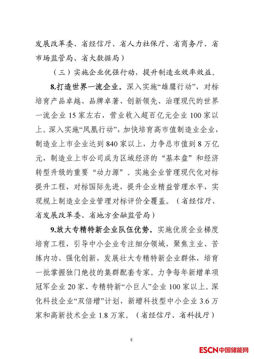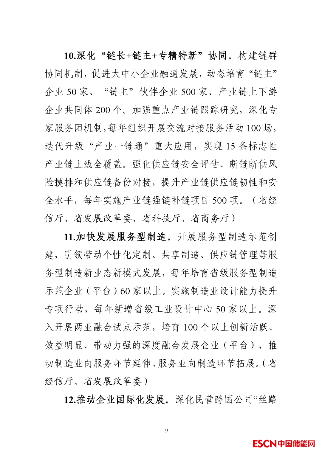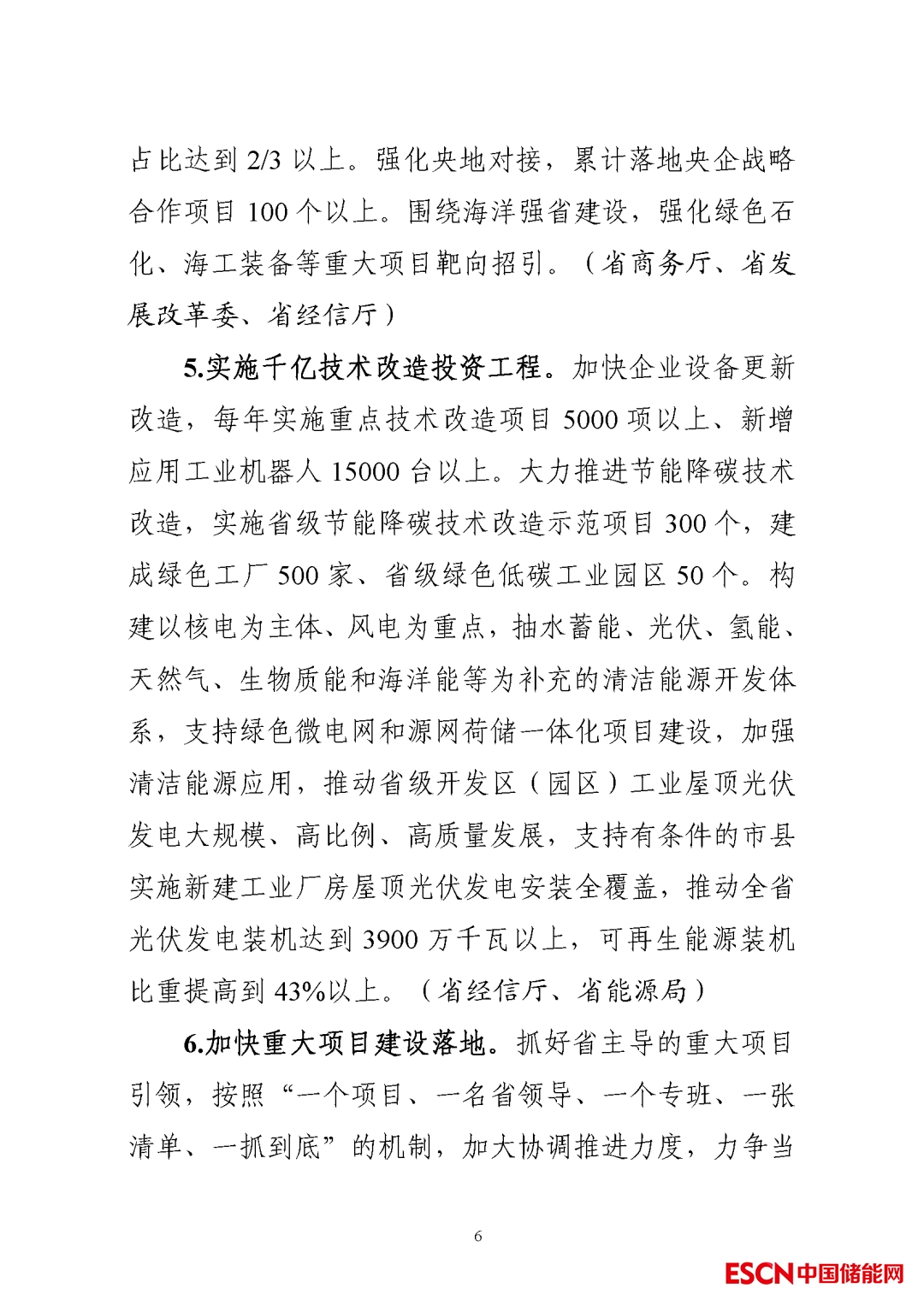 實施千億技術(shù)改造投資工程。加快企業(yè)設(shè)備更新改造,每年實施重點技術(shù)改造項目5000項以上、新增應(yīng)用工業(yè)機器人15000臺以上。大力推進節(jié)能降碳技術(shù)改造,實施省級節(jié)能降碳技術(shù)改造示范項目300個,建成綠色工廠500家、省級綠色低碳工業(yè)園區(qū)50個。構(gòu)建以核電為主體、風(fēng)電為重點,抽水蓄能、光伏、氫能、天然氣、生物質(zhì)能和海洋能等為補充的清潔能源開發(fā)體系,支持綠色微電網(wǎng)和源網(wǎng)荷儲一體化項目建設(shè),加強清潔能源應(yīng)用,推動省級開發(fā)區(qū)(園區(qū))工業(yè)屋頂光伏發(fā)電大規(guī)模、高比例、高質(zhì)量發(fā)展,支持有條件的市縣實施新建工業(yè)廠房屋頂光伏發(fā)電安裝全覆蓋,推動全省光伏發(fā)電裝機達到 3900 萬千瓦以上,可再生能源裝機比重提高到 43%以上。
