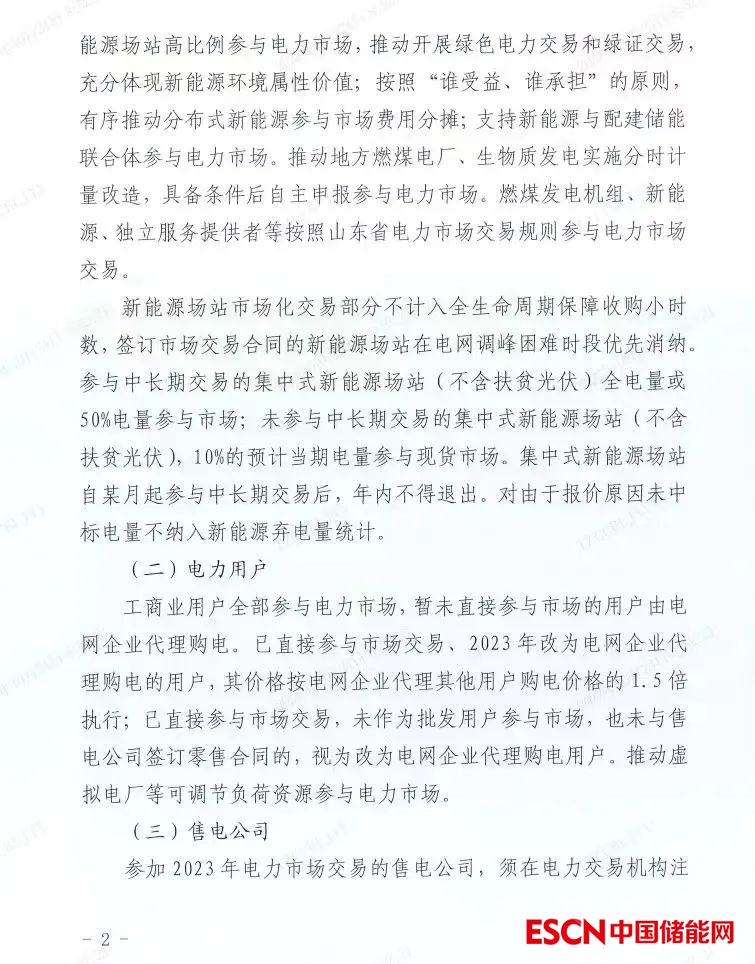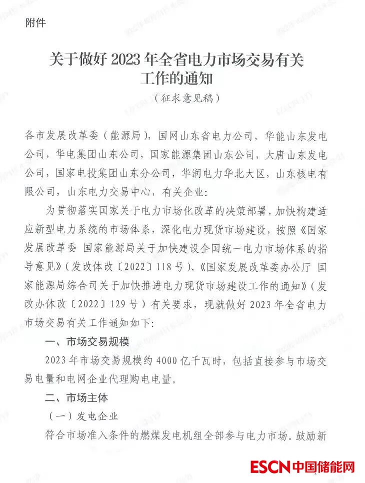 中國(guó)儲(chǔ)能網(wǎng)訊:10月20日,山東省能源局發(fā)布《關(guān)于征求2023年全省電力市場(chǎng)交易有關(guān)工作意見(jiàn)的通知》。