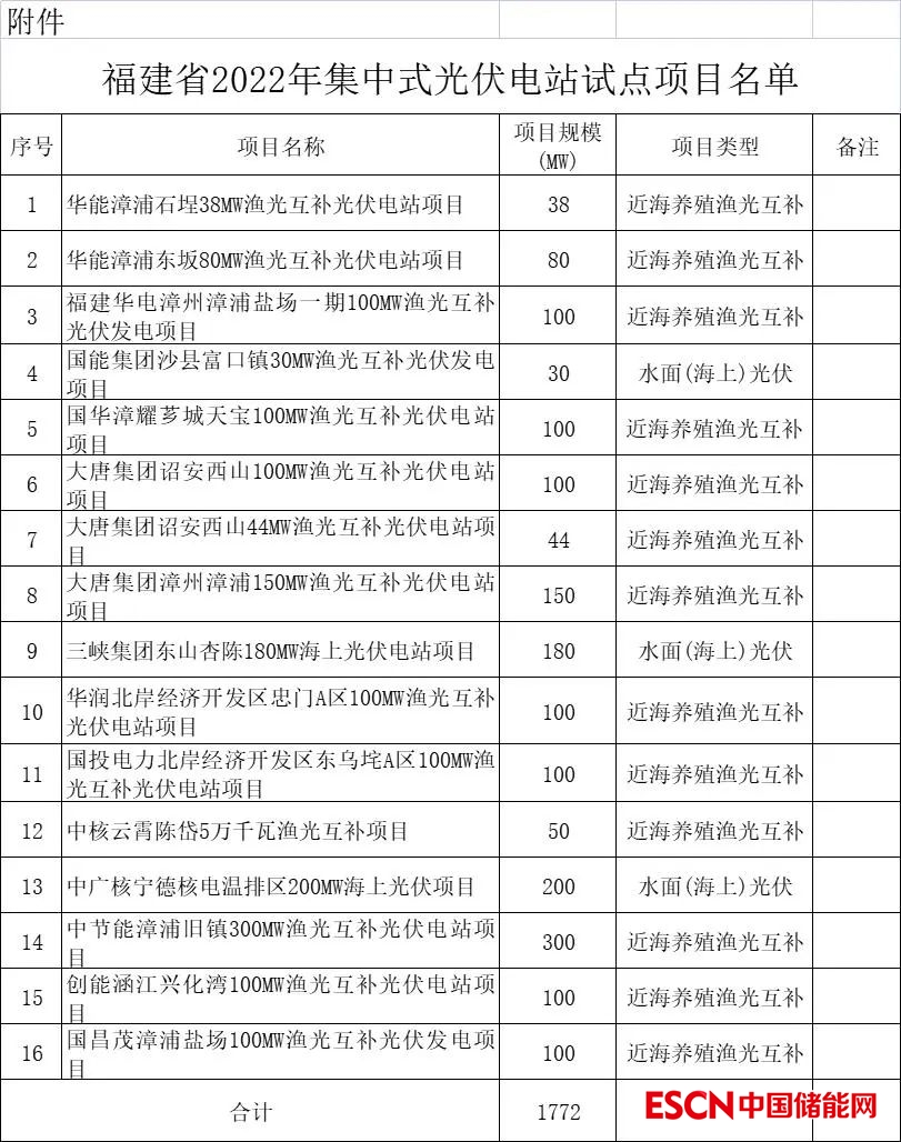 中國儲能網(wǎng)訊:10月20日,福建省發(fā)改委發(fā)布《2022年集中式光伏電站試點(diǎn)項目名單的通知》,共計16個項目,規(guī)模為1.772GW。