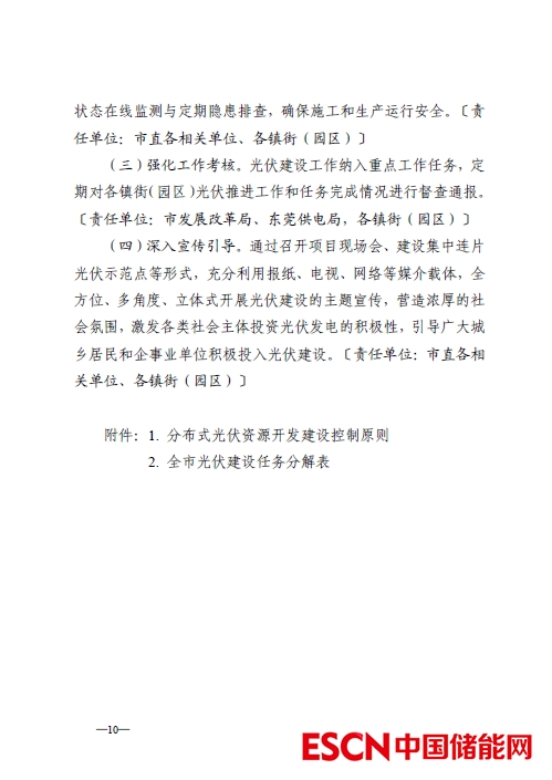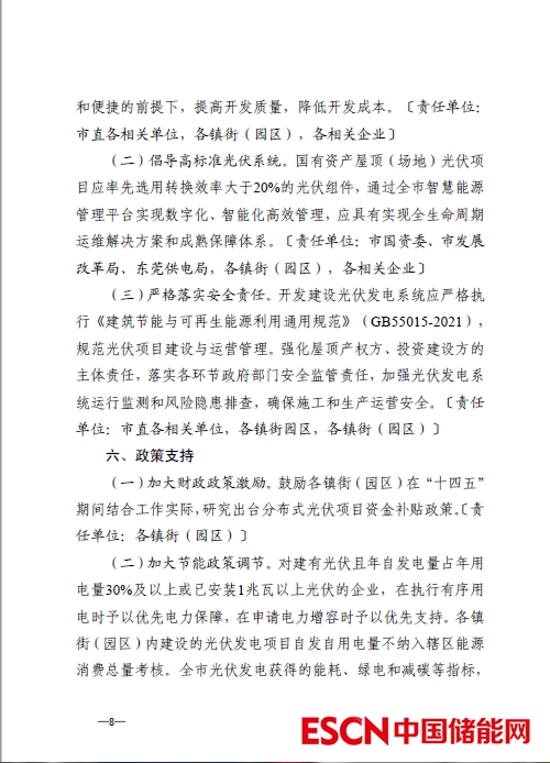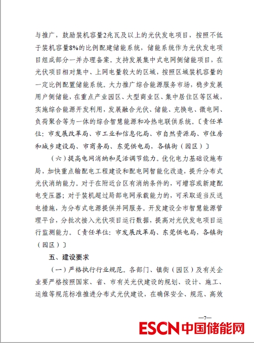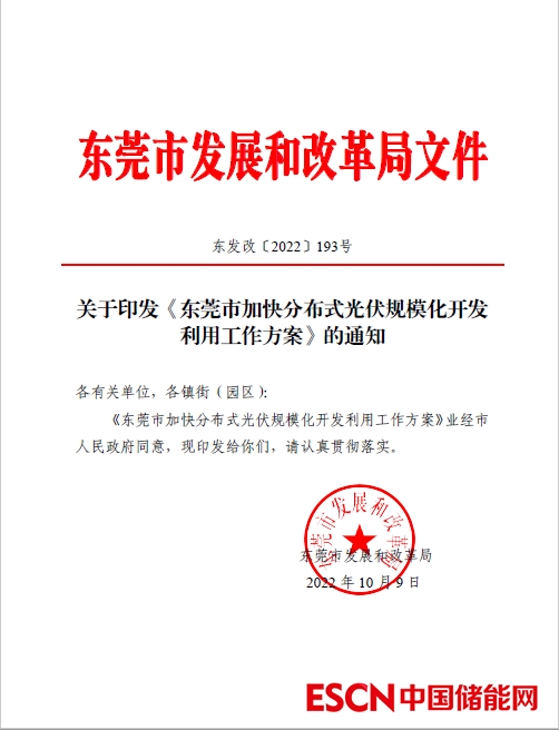 中國儲能網(wǎng)訊:10月9日,廣東東莞市發(fā)改委印發(fā)《東莞市加快分布式光伏規(guī)?;_發(fā)利用工作方案》。其中提出要推動光伏配建儲能設施建設,加大新型儲能技術應用與推廣,鼓勵裝機容量2兆瓦及以上的光伏發(fā)電項目,按照不低于裝機容量8%的比例配建儲能系統(tǒng),儲能系統(tǒng)作為光伏發(fā)電項目組成部分一并辦理備案。