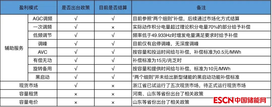 新型儲能電站的主要收益來源包括政策補(bǔ)貼、輔助服務(wù)、現(xiàn)貨市場、容量租賃、容量電價(jià)等。浙江省新型儲能盈利模式情況如下表: