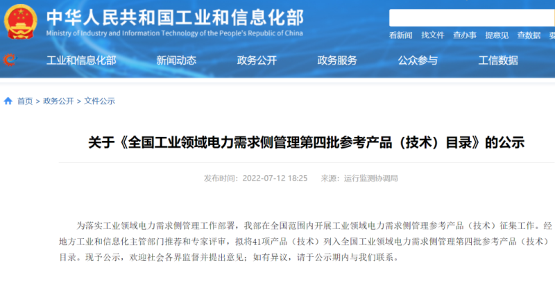 為落實(shí)工業(yè)領(lǐng)域電力需求側(cè)管理工作部署,我部在全國(guó)范圍內(nèi)開(kāi)展工業(yè)領(lǐng)域電力需求側(cè)管理參考產(chǎn)品(技術(shù))征集工作。經(jīng)地方工業(yè)和信息化主管部門(mén)推薦和專家評(píng)審,擬將41項(xiàng)產(chǎn)品(技術(shù))列入全國(guó)工業(yè)領(lǐng)域電力需求側(cè)管理第四批參考產(chǎn)品(技術(shù))目錄?,F(xiàn)予公示,歡迎社會(huì)各界監(jiān)督并提出意見(jiàn);如有異議,請(qǐng)于公示期內(nèi)與我們聯(lián)系。
