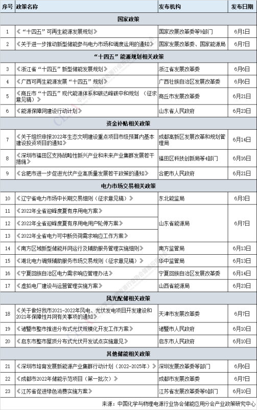中國儲能網(wǎng)訊:據(jù)中國儲能網(wǎng)統(tǒng)計,6月全國共發(fā)布23項儲能相關政策,其中國家政策2項,地方政策21項。涉及“十四五”可再生能源發(fā)展規(guī)劃、新型儲能參與電力市場和調度運用、資金補貼、虛擬電廠、能源保障、光伏配儲、電力需求響應、并網(wǎng)及輔助服務和源網(wǎng)荷儲一體項目管理等方面,以下對本月儲能相關政策進行了梳理解讀,與業(yè)界同仁共同交流探討。