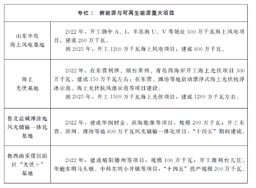(1)加快風(fēng)光“四基地、兩示范”建設(shè)。堅(jiān)持海陸并進(jìn)、集散并舉,大力發(fā)展風(fēng)電、光伏發(fā)電。到2025年,光伏發(fā)電、風(fēng)電裝機(jī)分別達(dá)到6500萬千瓦、2800萬千瓦;到2030年,分別達(dá)到1.25億千瓦、5500萬千瓦。海上風(fēng)電基地。打造山東半島海上風(fēng)電基地,聚焦渤中、半島南、半島北三大片區(qū),以省管海域?yàn)橹攸c(diǎn),加快啟動首批千萬千瓦海上風(fēng)電項(xiàng)目建設(shè),逐步推動海上風(fēng)電向深遠(yuǎn)海發(fā)展。探索推進(jìn)海上風(fēng)電軍民融合發(fā)展新模式。2022年,海上風(fēng)電開工500萬千瓦,建成200萬千瓦左右。到2025年,開工1200萬千瓦,建成800萬千瓦;到2030年,建成3500萬千瓦。海上光伏基地。按照“由近及遠(yuǎn)、由易到難、示范先行、分步實(shí)施”思路,以濱州、東營、濰坊、煙臺等市近海海域?yàn)橹攸c(diǎn),采用漁光互補(bǔ)、多能互補(bǔ)等模式,推動樁基固定式海上光伏項(xiàng)目開發(fā)建設(shè)。結(jié)合海上風(fēng)電開發(fā)布局,在具備條件的海域開展漂浮式海上光伏示范,打造“風(fēng)光同場”海上清潔能源基地。2022年,海上光伏開工300萬千瓦,建成150萬千瓦左右,啟動漂浮式海上光伏示范工作。到2025年,開工1500萬千瓦,建成1200萬千瓦左右;到2030年,建成4000萬千瓦左右。魯北鹽堿灘涂地風(fēng)光儲輸一體化基地。充分利用濰坊、濱州、東營等市的鹽堿灘涂地和菏澤等市的黃河灘涂地,推進(jìn)風(fēng)電、光伏、儲能等一體化設(shè)計(jì)、建設(shè)和運(yùn)營。到2025年,建成1000萬千瓦以上;到2030年,總開發(fā)規(guī)模達(dá)到2500萬千瓦。魯西南采煤沉陷區(qū)“光伏+”基地。以濟(jì)寧、泰安、棗莊、菏澤等市采煤沉陷區(qū)為重點(diǎn),采用漁光互補(bǔ)、農(nóng)光互補(bǔ)、生態(tài)治理等融合發(fā)展模式,推進(jìn)光伏發(fā)電基地建設(shè)。到2025年,基地光伏發(fā)電裝機(jī)達(dá)到300萬千瓦;到2030年,達(dá)到500萬千瓦。整縣分布式光伏規(guī)模化開發(fā)示范。全面啟動沂水、諸城、嘉祥等70個(gè)國家試點(diǎn)縣建設(shè)工作,推動黨政機(jī)關(guān)、公共建筑、工商業(yè)廠房和農(nóng)村居民屋頂?shù)确植际焦夥_發(fā)建設(shè)。到2025年,50%以上試點(diǎn)縣達(dá)到國家標(biāo)準(zhǔn),開發(fā)規(guī)模達(dá)到2000萬千瓦以上;到2030年,試點(diǎn)縣全部達(dá)到國家標(biāo)準(zhǔn),總開發(fā)規(guī)模達(dá)到3000萬千瓦以上?!鞍汆l(xiāng)千村”綠色能源發(fā)展示范。統(tǒng)籌推進(jìn)鄉(xiāng)村太陽能、生物質(zhì)能、地?zé)崮艿瓤稍偕茉炊嘣C合開發(fā)利用,打造農(nóng)村地區(qū)用電、取暖、炊事等一體化清潔用能新模式。到2025年,建成100個(gè)左右“標(biāo)桿鄉(xiāng)鎮(zhèn)”和1000個(gè)左右“標(biāo)桿村”;“十五五”期間,鄉(xiāng)村綠色能源發(fā)展模式得到全面推廣。(牽頭部門:省能源局,配合部門:省發(fā)展改革委、省住房城鄉(xiāng)建設(shè)廳、省水利廳、省農(nóng)業(yè)農(nóng)村廳、省海洋局)