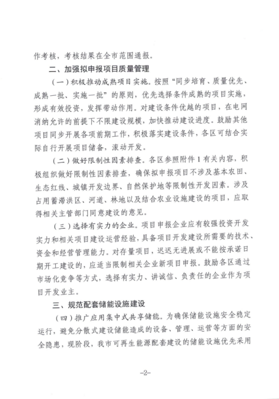 根據(jù)《通知》,加強擬申報項目質(zhì)量管理。對建設(shè)條件優(yōu)越的項目,在電網(wǎng)消納允許的前提下不限建設(shè)規(guī)模,加快推動建設(shè)進度。同時規(guī)范項目的配套儲能設(shè)施建設(shè),推廣應(yīng)用集中式共享儲能。