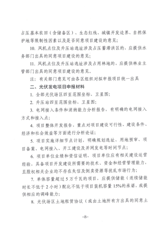 項目申報要求:嚴禁隨意拆分項目,相同或臨近地點建設(shè)的歸屬同一集團公司的多個項目,單體容量不超過5萬千瓦的,全部視為同一項目,儲能設(shè)施配比按終期建設(shè)容量考慮。單體容量超過5萬千瓦的項目,應(yīng)提供儲能(連續(xù)儲能時長不低于2小時)配比不低于項目裝機容量15%的承諾,或提供相應(yīng)的調(diào)峰能力。