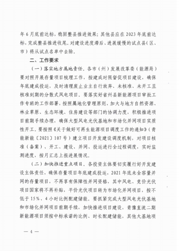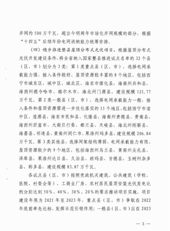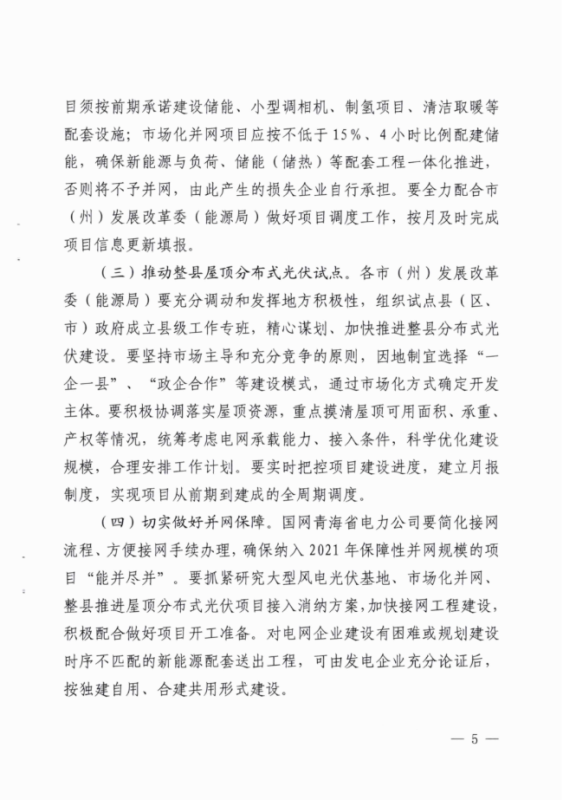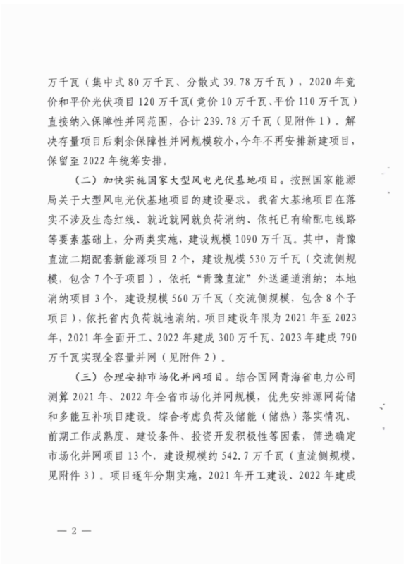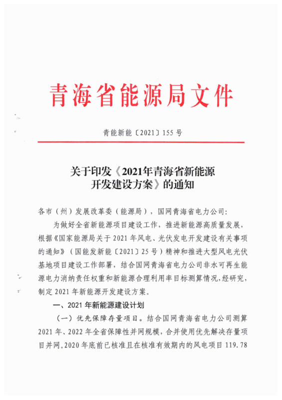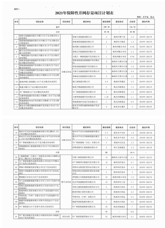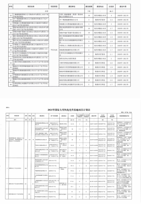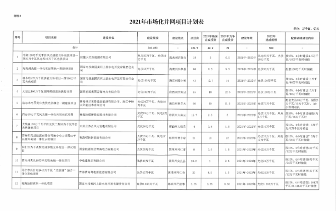 中國儲能網(wǎng)訊:根據(jù)近期獲悉的《2021年青海省新能源開發(fā)建設(shè)方案》,青海省2021年新能源建設(shè)計(jì)劃要求(1)優(yōu)先保障存量項(xiàng)目。2020年底前已核準(zhǔn)且在核準(zhǔn)有效期內(nèi)的風(fēng)電項(xiàng)目119.78萬千瓦(集中式80萬千瓦,分散式39.78萬千瓦),光伏項(xiàng)目120萬千瓦(競價(jià)10萬千瓦、平價(jià)11萬千瓦)。解決存量項(xiàng)目后剩余保障性并網(wǎng)規(guī)模較小,2021年不安排新建項(xiàng)目,保留至2022年統(tǒng)籌安排。(2)加快實(shí)施國家大型風(fēng)電光伏基地項(xiàng)目。青海省大基地項(xiàng)目分兩類實(shí)施,建設(shè)規(guī)模1090萬千瓦。其中,青豫直流二期配套新能源項(xiàng)目規(guī)模為530萬千瓦(交流側(cè)規(guī)模,包含7個子項(xiàng)目);本地消納項(xiàng)目3個,建設(shè)規(guī)模560萬千瓦。依托省內(nèi)負(fù)荷就地消納,項(xiàng)目建設(shè)年限為2021-2023年,2021年全面開工、2022年建成300萬千瓦、2023年建成790萬千瓦實(shí)現(xiàn)全容量并網(wǎng)。(3)合理安排市場化并網(wǎng)項(xiàng)目。優(yōu)先安排源網(wǎng)荷儲和多能互補(bǔ)項(xiàng)目建設(shè),篩選確定市場化并網(wǎng)項(xiàng)目13個,建設(shè)規(guī)模約542.7萬千瓦。項(xiàng)目逐年分期實(shí)施,2021年開工建設(shè)、2022年建成并網(wǎng)約500萬千瓦,超出2021-2022年市場化規(guī)模的項(xiàng)目,根據(jù)“十四五”后續(xù)年份電網(wǎng)消納能力統(tǒng)籌安排。(4)穩(wěn)步推進(jìn)整縣屋頂分布式光伏項(xiàng)目。根據(jù)文件,市場化并網(wǎng)項(xiàng)目要按照不低于15%、4小時比例配建儲能。對電網(wǎng)企業(yè)建設(shè)有困難或規(guī)劃建設(shè)時序不匹配的新能源配套送出工程,可由發(fā)電企業(yè)充分論證后,按獨(dú)建自用、合建共用形式建設(shè)。