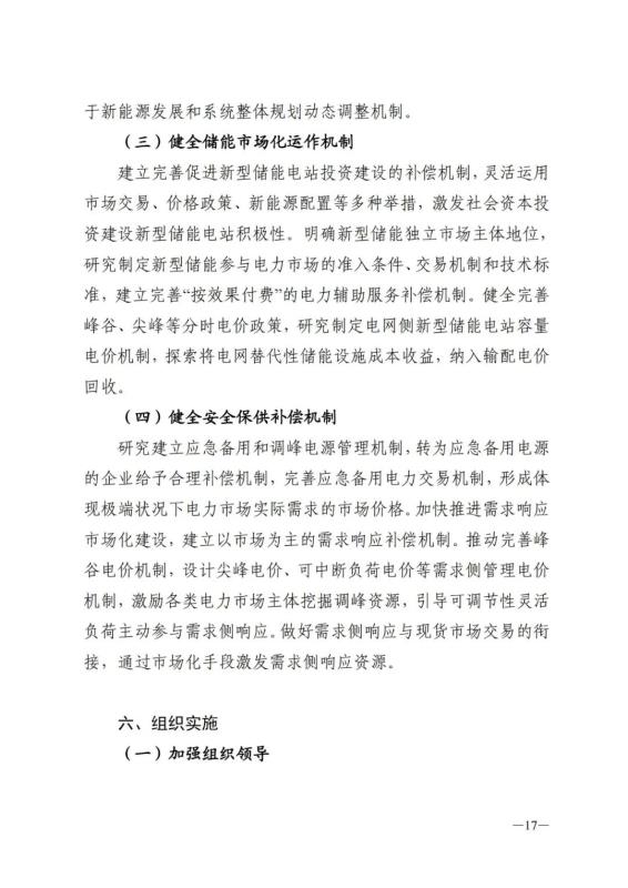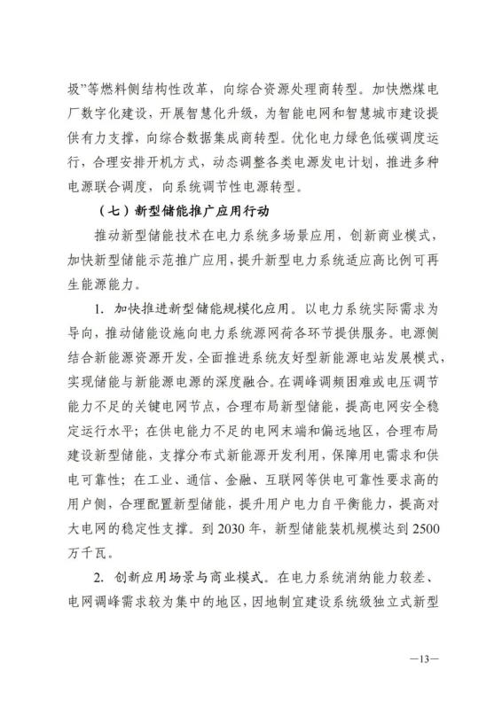 1、加快推進(jìn)新型儲(chǔ)能規(guī)?;瘧?yīng)用。以電力系統(tǒng)實(shí)際需求為導(dǎo)向,推動(dòng)儲(chǔ)能設(shè)施向電力系統(tǒng)源網(wǎng)荷各環(huán)節(jié)提供服務(wù)。電源側(cè)結(jié)合新能源資源開(kāi)發(fā),全面推進(jìn)系統(tǒng)友好型新能源電站發(fā)展模式,實(shí)現(xiàn)儲(chǔ)能與新能源電源的深度融合。在調(diào)峰調(diào)頻困難或電壓調(diào)節(jié)能力不足的關(guān)鍵電網(wǎng)節(jié)點(diǎn),合理布局新型儲(chǔ)能,提高電網(wǎng)安全穩(wěn)定運(yùn)行水平;在供電能力不足的電網(wǎng)末端和偏遠(yuǎn)地區(qū),合理布局建設(shè)新型儲(chǔ)能,支撐分布式新能源開(kāi)發(fā)利用,保障用電需求和供電可靠性;在工業(yè)、通信、金融、互聯(lián)網(wǎng)等供電可靠性要求高的用戶側(cè),合理配置新型儲(chǔ)能,提升用戶電力自平衡能力,提高對(duì)大電網(wǎng)的穩(wěn)定性支撐。到2030年,新型儲(chǔ)能裝機(jī)規(guī)模達(dá)到 2500萬(wàn)千瓦。