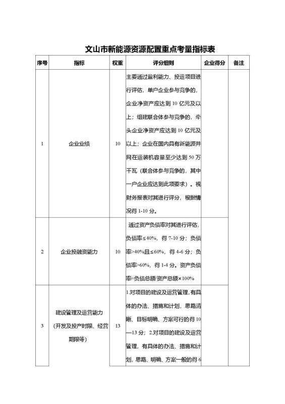 按照文山市新能源資源配置重點考量指標表,文山市人民政府將對申報企業(yè)業(yè)績、投融資能力、建設(shè)管理及運營能力、生產(chǎn)加工企業(yè)的能力以及在電源側(cè)配套儲能設(shè)施等能力,進行打分考核。其中承諾按規(guī)定10%的比例配套儲能設(shè)施部分占打分4%-5%。