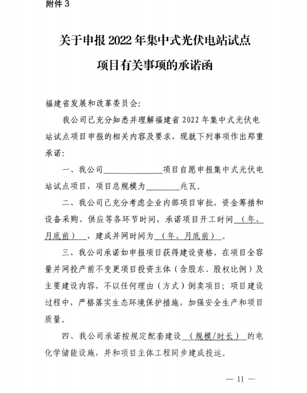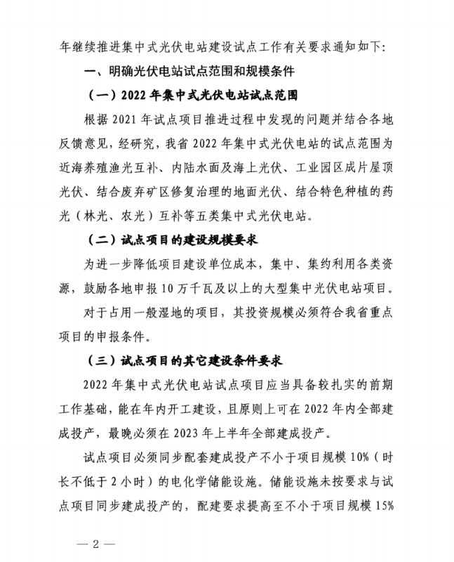 中國儲能網(wǎng)訊:3月29日,福建省發(fā)改委下發(fā)《關(guān)于組織開展2022年集中式光伏電站試點申報工作的通知》。《通知》要求,試點項目必須同步配套建成投產(chǎn)不小于項目規(guī)模10%(時長不低于2小時)的電化學(xué)儲能設(shè)施。儲能設(shè)施未按要求與試點項目同步建成投產(chǎn)的,配建要求提高至不小于項目規(guī)模15%(時長不低于4小時)。