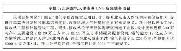 大幅提升天然氣應(yīng)急儲(chǔ)備能力。協(xié)調(diào)京津冀上下游資源設(shè)施,推動(dòng)完善天然氣資源調(diào)配機(jī)制。投運(yùn)唐山LNG應(yīng)急調(diào)峰工程,建成投運(yùn)北京燃?xì)馓旖蚰细跮NG接收站及外輸管線工程。到2025年,本市應(yīng)急儲(chǔ)備能力達(dá)到14億立方米左右。