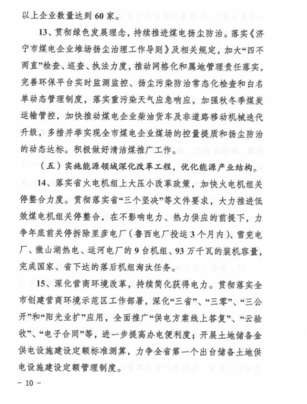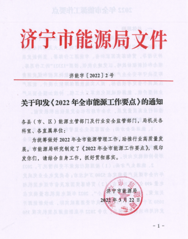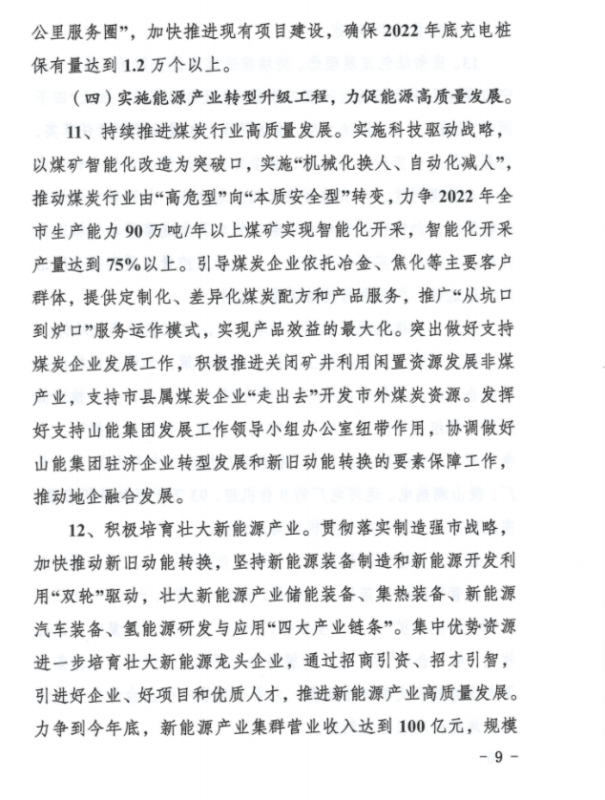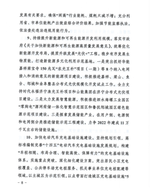 持續(xù)提升新能源和可再生能源開發(fā)利用規(guī)模。落實(shí)市政府《關(guān)于加快新能源和可再生能源高質(zhì)量發(fā)展意見》,統(tǒng)籌優(yōu)化新能源開發(fā)布局,提質(zhì)升級發(fā)展“光伏+”工程,穩(wěn)步有序發(fā)展生物質(zhì)能,打造新能源多元化利用示范基地。一是突出抓好華能嘉祥梁寶寺150兆瓦“農(nóng)光互補(bǔ)”項(xiàng)目(一期)等8個納入電網(wǎng)接入和消納意見的新能源項(xiàng)目建設(shè),積極推進(jìn)嘉祥、梁山、魚臺、鄒城和曲阜整縣分布式光伏規(guī)模化開發(fā)試點(diǎn)工作。全力支持時代永福濟(jì)寧漁光互補(bǔ)項(xiàng)目和山能集團(tuán)在濟(jì)寧分布式光伏項(xiàng)目建設(shè)。二是大力發(fā)展智慧能源,積極推進(jìn)泗水海螺工業(yè)園區(qū)“零購電”源網(wǎng)荷儲一體化智慧示范園區(qū)和魯抗鄒城園區(qū)綠色能源示范項(xiàng)目建設(shè)。三是探索發(fā)展儲能產(chǎn)業(yè),在用戶側(cè)、電源側(cè)和電網(wǎng)側(cè)分類推進(jìn)儲能示范工程建設(shè),力爭2022年建成11萬千瓦左右的儲能設(shè)施。