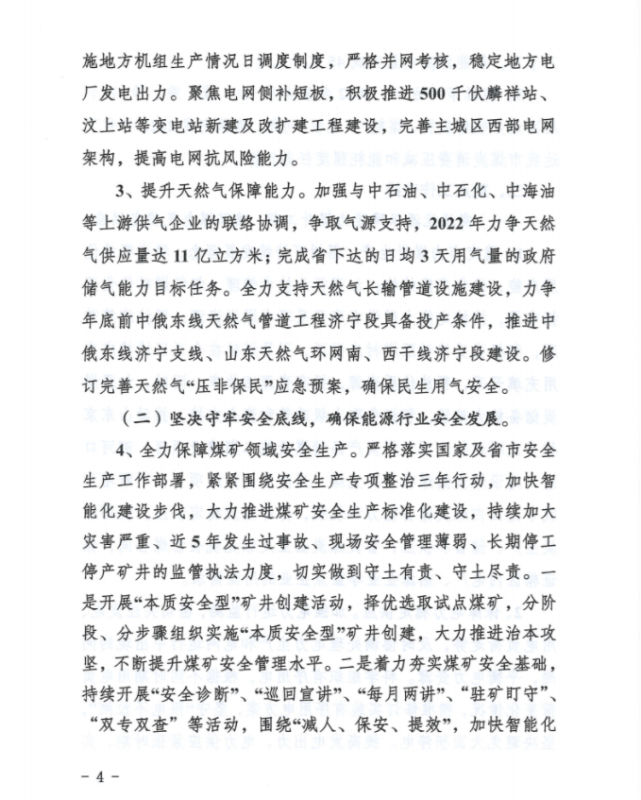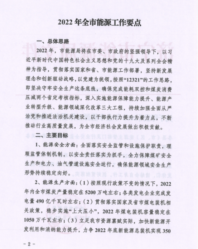 2、能源生產(chǎn)方面:(1)按照現(xiàn)行政策不變的情況下,2022年內(nèi)全市煤炭產(chǎn)量穩(wěn)定在5200萬噸左右;各類發(fā)電企業(yè)完成發(fā)電量490億千瓦時左右;(2)貫徹落實(shí)國家及省市煤電裝機(jī)相關(guān)政策,穩(wěn)步實(shí)施“上大壓小”,2022年煤電裝機(jī)容量穩(wěn)定在1050萬千瓦左右;(3)立足濟(jì)寧市資源稟賦實(shí)際,加快新能源開發(fā)利用和消納能力提升,力爭2022年底新能源總裝機(jī)實(shí)現(xiàn)350萬千瓦,新能源發(fā)電量完成45億千瓦時。