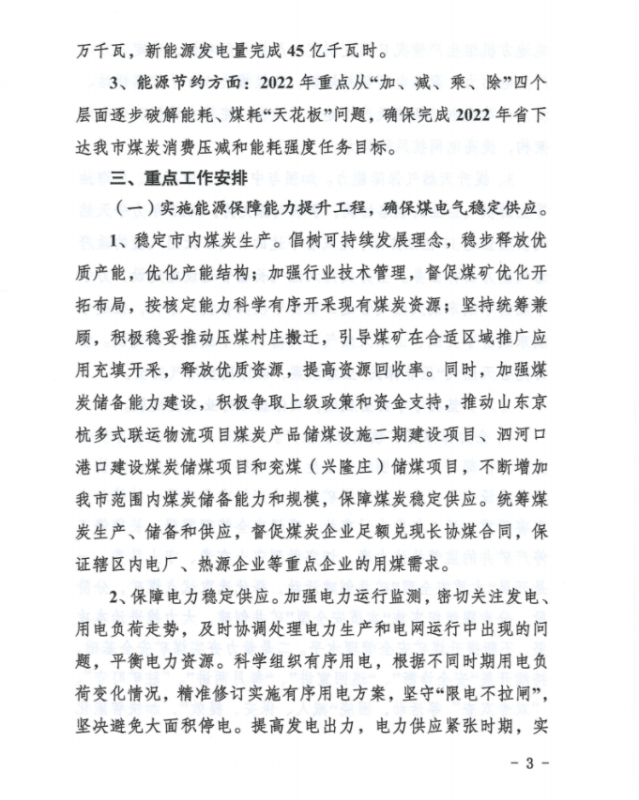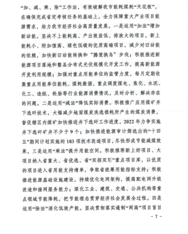 3、能源節(jié)約方面:2022年重點(diǎn)從“加、減、乘、除”四個層面逐步破解能耗、煤耗“天花板”問題,確保完成2022年省下達(dá)濟(jì)寧市煤炭消費(fèi)壓減和能耗強(qiáng)度任務(wù)目標(biāo)。