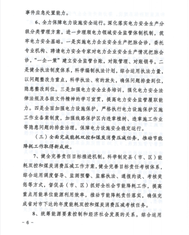 1、能源安全方面:全面落實(shí)安全監(jiān)管和設(shè)施保護(hù)職責(zé),理順監(jiān)管體制機(jī)制,以安全責(zé)任落實(shí)為抓手,全力保障煤礦安全生產(chǎn)和電力、油氣管道設(shè)施安全運(yùn)行,確保能源領(lǐng)域安全生產(chǎn)形勢持續(xù)穩(wěn)定向好。
