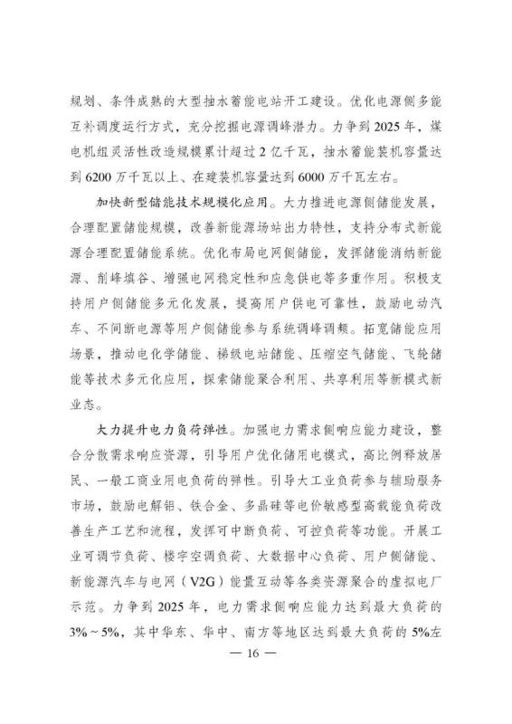 《規(guī)劃》提出要加快新型儲能技術(shù)規(guī)模化應用。大力推進電源側(cè)儲能發(fā)展,合理配置儲能規(guī)模,改善新能源場站出力特性,支持分布式新能源合理配置儲能系統(tǒng)。優(yōu)化布局電網(wǎng)俱儲能,發(fā)揮儲能消納新能源、削峰填谷、增強電網(wǎng)穩(wěn)定性和應急供電等多重作用。積極支持用戶側(cè)儲能多元化發(fā)展,提高用戶供電可靠性,鼓勵電動汽車、不間斷電源等用戶側(cè)儲能參與系統(tǒng)調(diào)峰調(diào)頻。拓寬儲能應用場景,推動電化學儲能、梯級電站儲能、壓縮空氣儲能、飛輪儲能等技術(shù)多元化應用,探索儲能聚合利用、共享利用等新模式新業(yè)態(tài)。