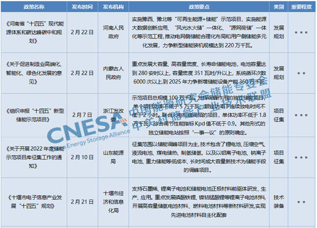 本月國家政策約七項(xiàng),主要集中在能源轉(zhuǎn)型的指導(dǎo)層面。2月10日國家發(fā)改委、能源局聯(lián)合印發(fā)《完善能源綠色低碳轉(zhuǎn)型體制機(jī)制和政策措施》,文件從體制機(jī)制、政策體系、治理方式等方面提出能源低碳綠色轉(zhuǎn)型的管理措施,并多次提到儲(chǔ)能及各應(yīng)用領(lǐng)域發(fā)展思路。在市場應(yīng)用方面:加快抽水蓄能電站建設(shè)、開展新型儲(chǔ)能項(xiàng)目研究示范、逐步擴(kuò)大新型儲(chǔ)能應(yīng)用、探索一體化參與電力系統(tǒng)運(yùn)行。在體制機(jī)制方面:支持儲(chǔ)能和負(fù)荷聚合商等新興市場主體獨(dú)立參與電力交易、完善支持儲(chǔ)能應(yīng)用的電價(jià)政策、研究價(jià)格補(bǔ)償機(jī)制、完善抽水蓄能和新型儲(chǔ)能參與電力市場的機(jī)制。