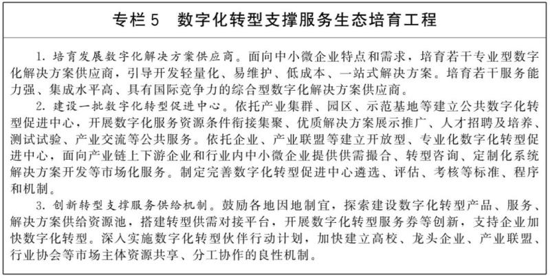 (四)培育轉(zhuǎn)型支撐服務(wù)生態(tài)。建立市場化服務(wù)與公共服務(wù)雙輪驅(qū)動,技術(shù)、資本、人才、數(shù)據(jù)等多要素支撐的數(shù)字化轉(zhuǎn)型服務(wù)生態(tài),解決企業(yè)“不會轉(zhuǎn)”、“不能轉(zhuǎn)”、“不敢轉(zhuǎn)”的難題。面向重點行業(yè)和企業(yè)轉(zhuǎn)型需求,培育推廣一批數(shù)字化解決方案。聚焦轉(zhuǎn)型咨詢、標(biāo)準(zhǔn)制定、測試評估等方向,培育一批第三方專業(yè)化服務(wù)機構(gòu),提升數(shù)字化轉(zhuǎn)型服務(wù)市場規(guī)模和活力。支持高校、龍頭企業(yè)、行業(yè)協(xié)會等加強協(xié)同,建設(shè)綜合測試驗證環(huán)境,加強產(chǎn)業(yè)共性解決方案供給。建設(shè)數(shù)字化轉(zhuǎn)型促進中心,銜接集聚各類資源條件,提供數(shù)字化轉(zhuǎn)型公共服務(wù),打造區(qū)域產(chǎn)業(yè)數(shù)字化創(chuàng)新綜合體,帶動傳統(tǒng)產(chǎn)業(yè)數(shù)字化轉(zhuǎn)型。