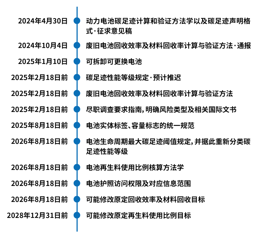 縱覽《電池法》二級法案發(fā)布情況,原計劃于2024年2月正式發(fā)布的碳足跡二級法案僅在歐洲議會官網(wǎng)發(fā)布征求意見稿,預(yù)計原定于今年2月正式發(fā)布的碳足跡等級規(guī)定將一并推遲;回收率二級法案已通報,根據(jù)《電池法》規(guī)劃預(yù)計今年2月正式發(fā)布,預(yù)計同期發(fā)布的還有盡職調(diào)查要求指南;今年8月18日前還預(yù)計發(fā)布電池實體標簽、容量標志的統(tǒng)一規(guī)范。2026年,碳足跡最大閾值、電池護照訪問權(quán)限、再生料比例核算二級法案將發(fā)布,回收率要求或?qū)⑿薷摹I鲜龆壏ò讣把a充規(guī)范,均需要企業(yè)做好研究應(yīng)對工作。