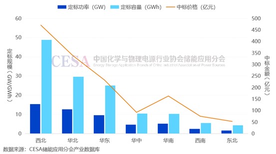 此外,華中地區(qū)定標規(guī)模4.68GW/10.51GWh,容量占比7.76%,總金額達92.42億元。華南地區(qū)采招落地5.24GW/10.21GWh,容量占比7.61%,總成交金額達163.33億元。西南地區(qū)定標規(guī)模2.46GW/5.61GWh,容量占比4.18%,總金額75.41億元。東北地區(qū)采招落地1.65GW/4.34GWh,容量占比3.23%,總成交金額52.94億元。