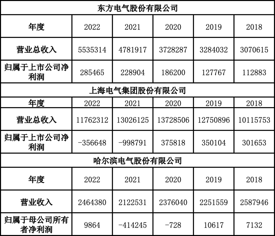 上海電氣集團、哈爾濱電氣集團、東方電氣集團是國內(nèi)三大電力裝備企業(yè)。從上市公司業(yè)績來看,三家企業(yè)均面臨不同程度的經(jīng)營壓力。與上海電氣集團股份有限公司類似,哈爾濱電氣股份有限公司2020—2021年連續(xù)兩年虧損,2022年剛剛扭虧。