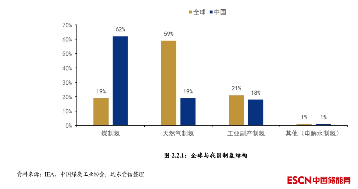 目前氫氣的生產(chǎn)方式主要分為三種,分別為化石燃料制氫、工業(yè)副產(chǎn)制氫和電解水制氫?;剂现茪渲饕?以煤炭為還原劑水蒸氣為氧化劑,在高溫下將碳轉(zhuǎn)化為 CO 和 H2為主的合成氣,然后經(jīng)過煤氣凈化、CO 轉(zhuǎn)化以及 H2提純等主要生產(chǎn)環(huán)節(jié),最終生成氫氣。工業(yè)副產(chǎn)制氫是指在生產(chǎn)過程中,利用富含氫氣的終端廢棄物或副產(chǎn)物作為原材料,采用變壓吸附法(PSA)回收提純制取氫氣。電解水制氫,顧名思義是通過對加入電解液的水通電,分解成為氫氣和氧氣。