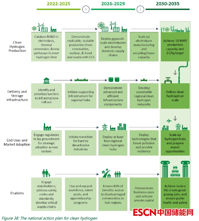 (3)聚焦區(qū)域網(wǎng)絡(luò)。這包括區(qū)域清潔氫能中心(clean hydrogen hubs),以實(shí)現(xiàn)大規(guī)模的清潔氫生產(chǎn)和就近的終端使用,還可實(shí)現(xiàn)關(guān)鍵的大規(guī)?;A(chǔ)設(shè)施,推動(dòng)規(guī)?;l(fā)展,促進(jìn)市場起步,同時(shí)利用基于地方的機(jī)會實(shí)現(xiàn)公平、包容和可持續(xù)性。其優(yōu)先事項(xiàng)將包括近期影響、創(chuàng)造就業(yè)機(jī)會(包括高薪工會工作)以及啟動(dòng)國內(nèi)制造業(yè)和私營部門的投資。
