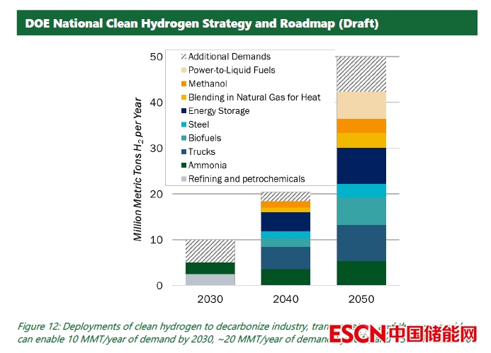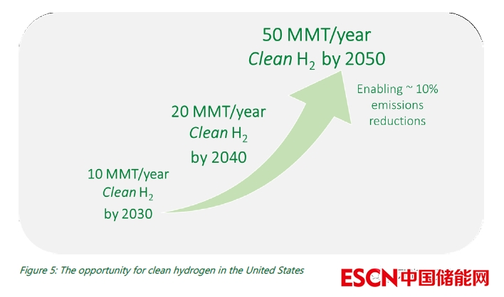 報(bào)告提供了當(dāng)今美國氫能生產(chǎn)、運(yùn)輸、儲存和使用的情況,以及清潔氫在促進(jìn)不同部門國家目標(biāo)方面所能提供的機(jī)會。清潔氫能脫碳應(yīng)用的路徑取決于 2030 年、2040 年和 2050 年的需求情景——到 2030 年每年生產(chǎn) 1000 萬噸 (10 MMT)、到 2040 年每年 2000萬噸以及到 2050 年每年 5000萬噸的戰(zhàn)略機(jī)遇。