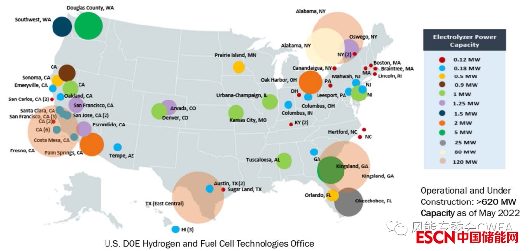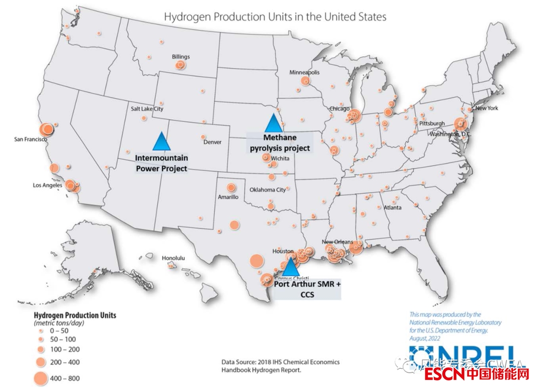 上2圖:美國制氫技術(shù)部署示例。生產(chǎn)能力規(guī)模由圓圈的大小近似表示