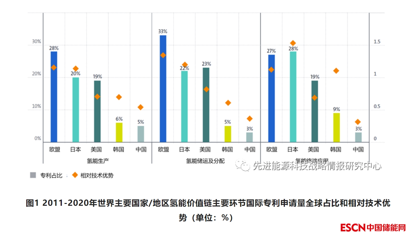 2011-2020年約一半的氫能國際專利與制氫相關(guān),其余分布在氫的存儲、分配、輸運和終端應(yīng)用等環(huán)節(jié)。約28%的氫能國際專利由歐洲國家申請,其在三大主要環(huán)節(jié)(氫能生產(chǎn)、儲運及分配、終端應(yīng)用)的相對技術(shù)優(yōu)勢(RTA)指數(shù)也領(lǐng)先于其他主要氫能創(chuàng)新國家(圖1)。日本也具有較強的氫能創(chuàng)新實力,貢獻了約24%的國際專利,且其增速快于歐洲,兩者的年均復合增長率分別為6.2%和4.5%。美國貢獻了20%的氫能國際專利,是主要氫能創(chuàng)新國家中唯一申請量下降的國家。韓國(7%)和中國(4%)國際專利申請數(shù)量有限但穩(wěn)步增長,年均復合增長率分別達到12.2%和15.2%。