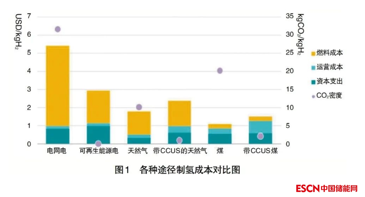 電解水所產(chǎn)氫氣為“綠氫”,被認為是氫氣生產(chǎn)的最終方向。目前,綠氫成本遠遠高于其他傳統(tǒng)制氫方式,我國不同制氫途徑的成本對比如圖1所示。