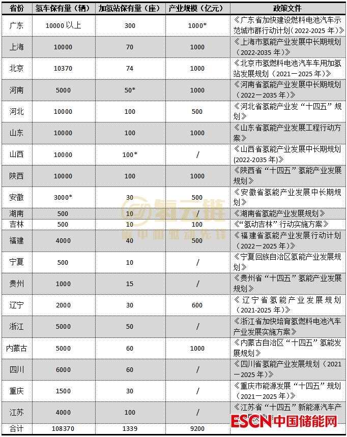 統(tǒng)計說明:各省份均以最新文件統(tǒng)計,帶星號的為估算值,其中加氫站以100輛氫車配1座加氫站的比例估算,廣東省產(chǎn)業(yè)規(guī)模則根據(jù)北京和上海的類比估算,保守估計為1000億。