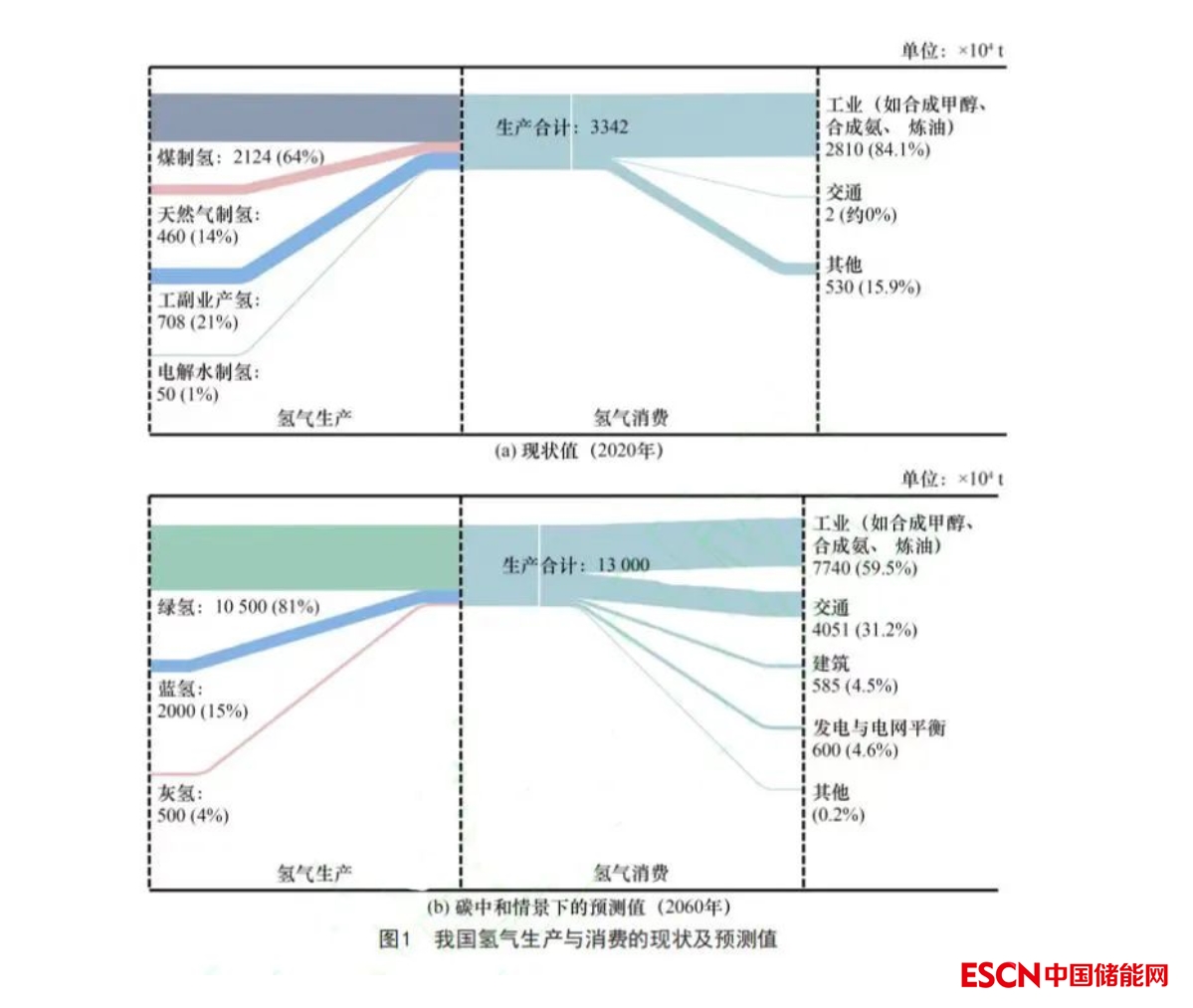 著眼中長(zhǎng)期,預(yù)計(jì)2060年我國(guó)氫氣需求量超過(guò)1×108t,氫能占終端能源消費(fèi)的比重約為20%,主要作為原料、燃料應(yīng)用于工業(yè)和交通領(lǐng)域(分別占需求總量的60%、30%,見(jiàn)圖1)。在碳中和情景下,若基于目前以化石能源制氫為主體的氫能供應(yīng)體系,氫氣生產(chǎn)的碳排放量預(yù)計(jì)為1×109t/a,遠(yuǎn)高于碳匯所能中和的碳排放量。因此,在推動(dòng)實(shí)現(xiàn)碳中和目標(biāo)的過(guò)程中,氫能供應(yīng)體系需逐步以綠氫為基礎(chǔ)進(jìn)行重塑,輔以加裝碳捕集裝置的化石能源制氫方式,才能改變氫能生產(chǎn)側(cè)的高碳格局。預(yù)計(jì)在碳中和情景下,氫能生產(chǎn)側(cè)的綠氫產(chǎn)量為1×108t/a,在全部氫能中的占比超過(guò)80%。綠氫生產(chǎn)總量和占比均逐步提升,在推動(dòng)氫能供應(yīng)體系變革的同時(shí),為氫能在能源電力轉(zhuǎn)型中發(fā)揮更大價(jià)值創(chuàng)造了條件。