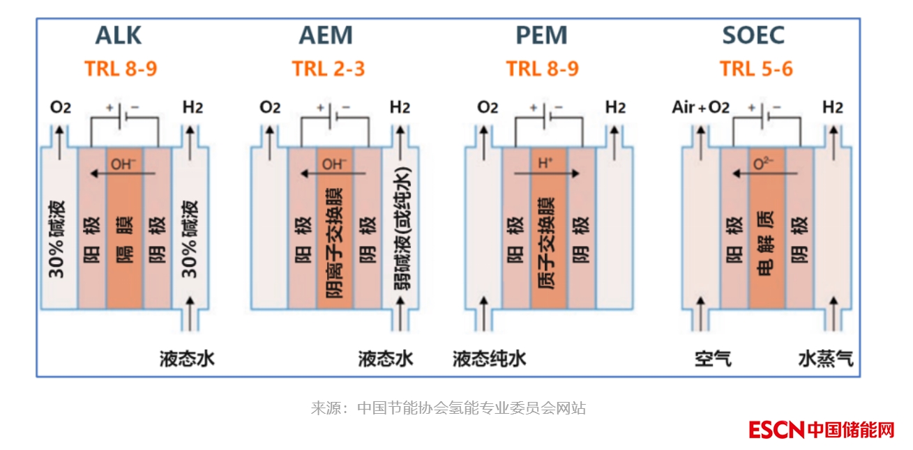 結(jié)合市場現(xiàn)狀,當(dāng)前主流技術(shù)有以下四種:堿性電解水(ALK)、質(zhì)子交換膜電解水(PEM)、固體氧化物電解水(SOEC)和陰離子交換膜電解水(AEM)。