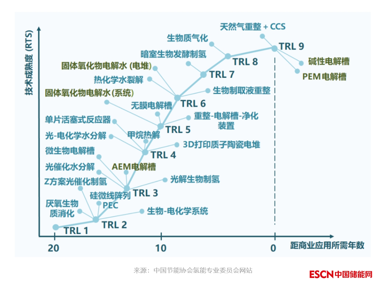 但電解水制氫若想在數(shù)據(jù)中心實(shí)現(xiàn)規(guī)?;瘧?yīng)用,離不開技術(shù)成熟度(Technology Readiness Level,TRL)的不斷提高,簡單說,技術(shù)成熟度越高,市場需求越大,規(guī)?;瘽M足后成本將會出現(xiàn)大幅下降,經(jīng)濟(jì)性獲得大幅提升,市場空間才會被徹底打開。