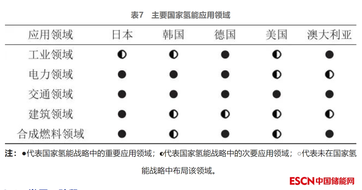 注:●代表國(guó)家氫能戰(zhàn)略中的重要應(yīng)用領(lǐng)域;圖片代表國(guó)家氫能戰(zhàn)略中的次要應(yīng)用領(lǐng)域;○代表未在國(guó)家氫能戰(zhàn)略中布局該領(lǐng)域。