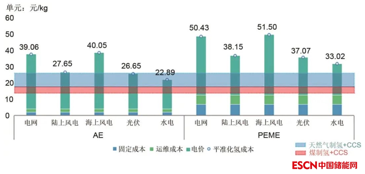 可再生氫的平準(zhǔn)化成本成為各國(guó)氫源結(jié)構(gòu)過渡的關(guān)鍵??稍偕鷼涑杀局饕Q于度電成本、電解槽的投資成本以及利用負(fù)荷。其中,度電成本對(duì)電解水制氫成本的影響敏感性最高,約占總成本的70%~90%。如圖4所示,以2000 m3/h堿性電解水制氫項(xiàng)目為例,負(fù)荷率95%條件下,當(dāng)采用工業(yè)電價(jià)0.616元/kWh時(shí),制氫成本約為39.06元/kg。當(dāng)前水電、陸上風(fēng)電、海上風(fēng)電、光伏的度電平準(zhǔn)化成本分別為0.33元/kWh、0.41元/kWh、0.63元/kWh、0.40元/kWh,對(duì)應(yīng)的平準(zhǔn)化氫氣成本分別為22.89元/kg、27.65元/kg、40.05元/kg、26.65元/kg。而當(dāng)前PEM電解水制氫設(shè)備比ALK高出5倍以上,平準(zhǔn)化氫氣成本將增加40%左右??稍偕茉粗茪涑杀緦殡S技術(shù)進(jìn)步與裝機(jī)規(guī)模增長(zhǎng)持續(xù)下降,當(dāng)風(fēng)電光伏度電成本低于0.3元/kWh時(shí),具備與天然氣制氫的成本競(jìng)爭(zhēng)力(15~23元/kg),度電成本低于0.2元/kWh時(shí),具備與煤制氫+CCS的成本競(jìng)爭(zhēng)力(15~18元/kg H2)。可再生氫平準(zhǔn)化成本的平價(jià)化,支撐各國(guó)氫源結(jié)構(gòu)轉(zhuǎn)型。