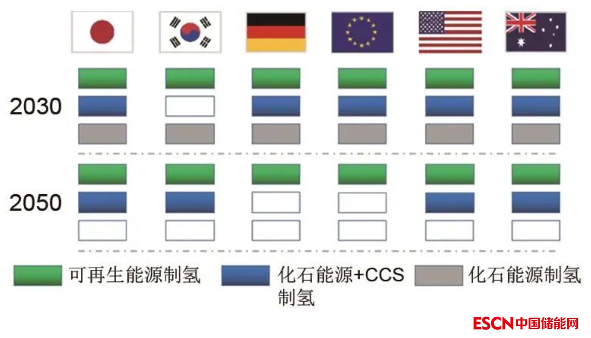 各國(guó)將清潔氫視為清潔能源轉(zhuǎn)型與碳中和的重要路徑,其主要有兩條技術(shù)路線:化石燃料制氫耦合CCS技術(shù)和可再生能源電解水制氫。但各國(guó)在實(shí)現(xiàn)未來凈零排放的路徑上呈現(xiàn)明顯差異:在中期(2030年左右),以脫碳為主要驅(qū)動(dòng)力的歐洲國(guó)家,普遍確立了可再生氫的優(yōu)勢(shì)地位;以保障能源安全為主要驅(qū)動(dòng)力的日本,國(guó)內(nèi)居民端應(yīng)用基于現(xiàn)有化石能源基礎(chǔ)設(shè)施部署,并通過打造國(guó)際綠色氫能供應(yīng)鏈來實(shí)現(xiàn)綠色發(fā)展。韓國(guó)也計(jì)劃逐步由天然氣制氫過渡為可再生氫。以技術(shù)領(lǐng)先的美國(guó)和以能源出口轉(zhuǎn)型為主要發(fā)展驅(qū)動(dòng)力的澳大利亞,根據(jù)本國(guó)資源,分別采取技術(shù)中立與可再生氫優(yōu)先的戰(zhàn)略。在遠(yuǎn)期(2050年),幾乎所有國(guó)家都認(rèn)可可再生氫的優(yōu)先性,歐洲甚至認(rèn)為可再生氫是碳中和時(shí)代的唯一氫源選擇。