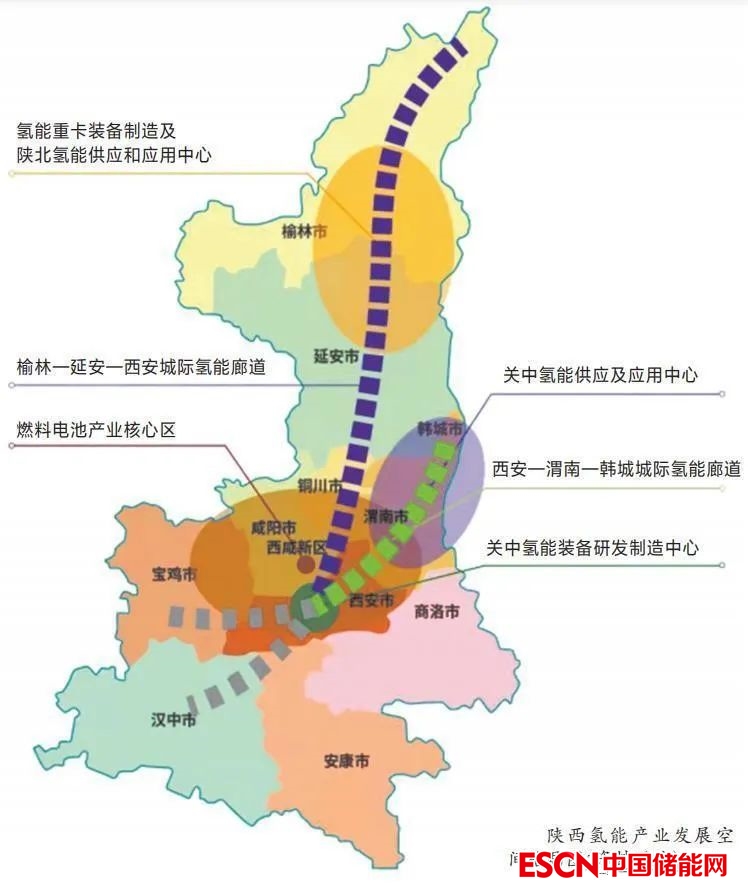 值得注意的是,陜西在規(guī)劃氫能產(chǎn)業(yè)發(fā)展時,堅持錯位協(xié)同發(fā)展,立足氫資源和科技創(chuàng)新資源分布,統(tǒng)籌各市產(chǎn)業(yè)基礎(chǔ),加強頂層設(shè)計,避免一哄而上、同質(zhì)化競爭。按照《規(guī)劃》,陜西將打造“一核引領(lǐng),兩軸聯(lián)通,三心支撐”的氫能產(chǎn)業(yè)發(fā)展格局。其中,“一核”引領(lǐng),是依托西咸新區(qū)打造燃料電池產(chǎn)業(yè)核心區(qū);“兩軸”聯(lián)通,是指打造榆林—延安—西安城際氫能廊道、西安—渭南—韓城城際氫能廊道,聯(lián)通陜北、關(guān)中地區(qū)氫能消費中心和供應(yīng)中心,建設(shè)榆林、西安、渭南互為支撐的氫能產(chǎn)業(yè)集群;“三心”支撐,是指打造以西安為中心的關(guān)中氫能裝備研發(fā)制造中心,以榆林為核心的氫能重卡裝備制造及陜北氫能供應(yīng)和應(yīng)用中心,以渭南為核心的關(guān)中氫能供應(yīng)及應(yīng)用中心。