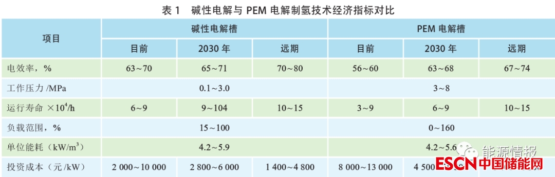 我國以可再生能源(如風電、光伏、水電)進行電解水制氫,電價控制在0.25元/kWh以下時,制氫成本具有相對經(jīng)濟性(15.3~20.9元/kg)。堿性電解與PEM電解制氫技術(shù)經(jīng)濟指標見表1。