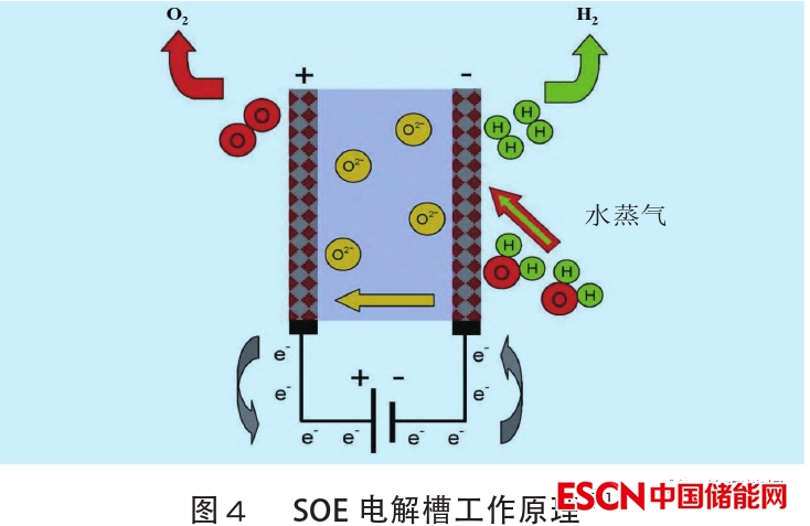 固體氧化物電解槽(SOE)利用高溫水蒸氣(600~900℃)電解,效率高于堿性電解槽和PEM電解槽。20世紀60年代,美國和德國就開始進行SOE高溫水蒸氣的相關(guān)研究。SOE電解槽的工作原理如圖4所示。循環(huán)氫氣和水蒸氣從陽極進入反應(yīng)系統(tǒng),水蒸氣在陰極電解成氫氣,陰極產(chǎn)生的O2–通過固體電解質(zhì)移動到陽極,重新結(jié)合形成氧氣并釋放電子。