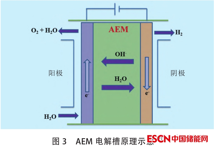 AEM在某種程度上是PEM和傳統(tǒng)的隔膜基堿液電解的混合。AEM電解槽原理如圖3所示,在陰極,水被還原產(chǎn)生氫氣和OH–。OH–通過隔膜流向陽極,在陽極表面重新結(jié)合產(chǎn)生氧氣。