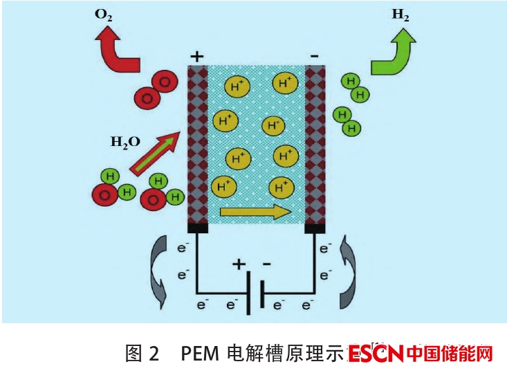 陽極、陰極和膜組構(gòu)成膜電極組件(MEA),電極通常由鉑或銥等貴金屬組成。在陽極,水被氧化產(chǎn)生氧氣、電子和質(zhì)子。在陰極,陽極產(chǎn)生的氧氣、電子和質(zhì)子通過膜循環(huán)到陰極,被還原產(chǎn)生氫氣。PEM電解槽的原理如圖2所示。
