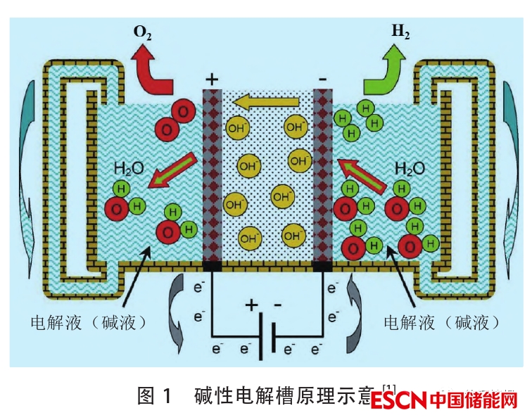 堿性電解槽的工作原理如圖1所示。電池由兩個電極組成,兩個電極由氣密隔膜分開。電池裝配時浸沒在高濃度的堿性液體電解質(zhì)KOH(20%~30%)中,使離子電導(dǎo)率最大化,NaOH和NaCl溶液也可作電解液,但不常用,電解液的主要缺點是具有腐蝕性。電解槽的工作溫度為65~100℃,電解槽陰極產(chǎn)生氫氣,生成的OH–通過隔膜流向陽極,在陽極表面重新結(jié)合產(chǎn)生氧氣。先進的堿性電解槽適合大規(guī)模制氫,一些制造商制造的堿性電解槽在(500~760Nm3/h)具有非常高的產(chǎn)氫能力,相應(yīng)的耗電量為2150~3534kW。