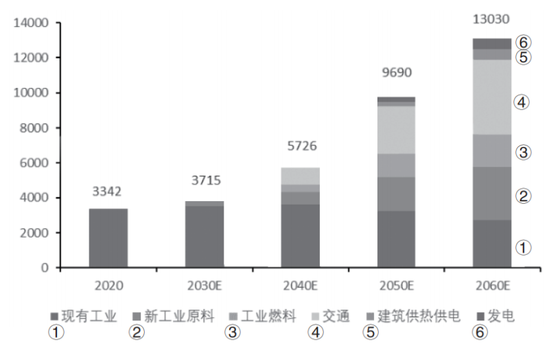 圖2 我國(guó)氫氣消費(fèi)需求預(yù)測(cè)