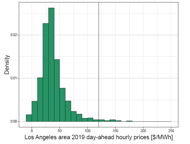 在上一節(jié)中考慮的三種發(fā)電技術中,在模擬的所有案例中,聯(lián)合循環(huán)發(fā)電廠產(chǎn)生的氫基電力成本最低。值得注意的是,在“現(xiàn)實”的未來案例中,該技術實現(xiàn)的氫氣最低成本為1美元/kg和30%的產(chǎn)能系數(shù),約為120美元/MWh。圖5.16顯示了2019年洛杉磯地區(qū)的一天每小時電價的直方圖;垂直線表示每小時120美元/MWh價格。